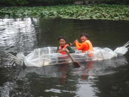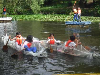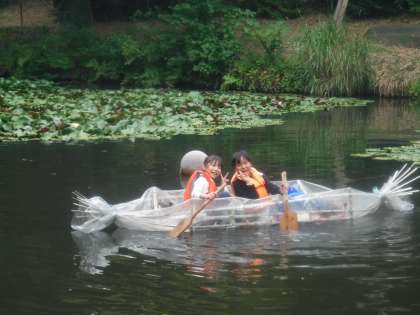 自分たちでつくった舟を浮かべ、オールで漕ぎながら池を探索しました。ちゃんと水辺に浮かんでとても嬉しそうでした。