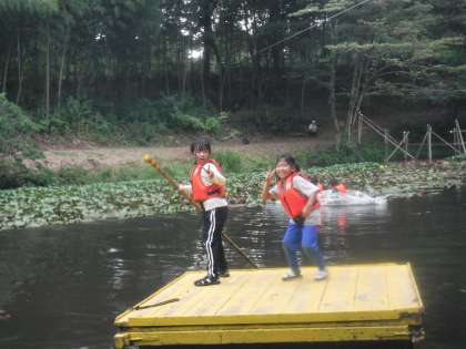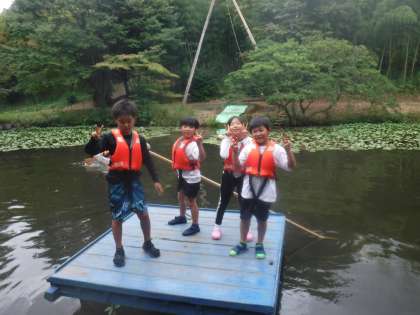 9月13日(水) 4年生 宿泊学習 〜6〜 公開日 2023/09/17 更新日 2023/09/17 4年生 池遊びでは、いかだに乗って池を1周。竹一本でいかだを操作することが意外と難しかったようです。
