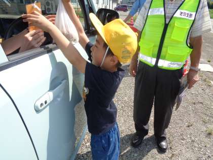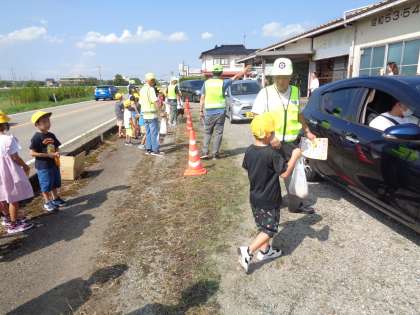 老田地区の事故ナシ作戦がありました。交通安全協会や富山西警察の方から交通安全の話をしていただきました。その後、子供たちは、「安全運転をお願いします」と言いながら、ドライバーの方にしおりと梨を配りました。