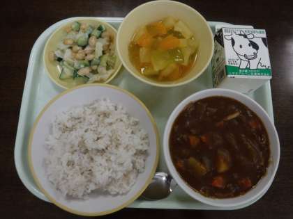 子供たちに人気の食べキリンハヤシのルウには、ハヤシルウ、リンゴピューレ、醤油、ウスターソース、赤ワイン、トマトピューレが使われています。マイルドでこくのあるハヤシルウを麦ご飯にたっぷりかけていただきました。