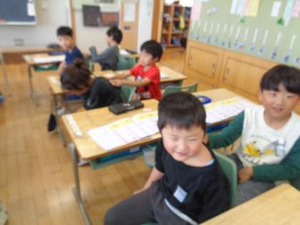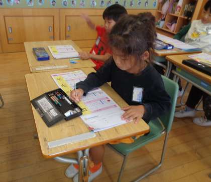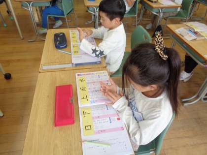 漢字の学習に取り組んでいます。空書きやなぞり書きをしながら、「とめ・はね・はらい」に気を付けて学習しています。