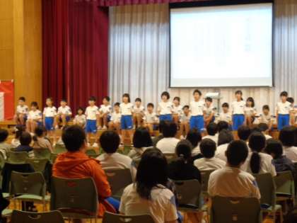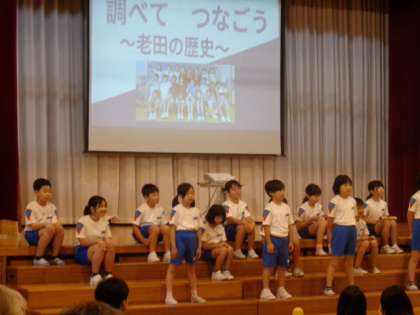 総合的な学習の時間に調べてきた老田小学校の歴史、校舎の歴史、校区の獅子舞について大きな声で元気いっぱいに発表しました。最後には、心一つに迫力のある「お祭り」の群読をし、やり切った満足感でいっぱいの4年生でした。