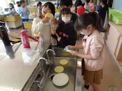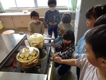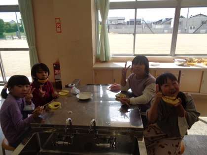2年生は以前収穫したさつまいもでふかし芋をつくりました。初めての体験でしたが、みんなで協力して準備、調理をしました。実食する際は、「おいしい!」という歓声がたくさん聞こえてきました。
