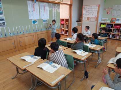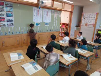 「じどう車くらべ」の学習では、「しごと」と「つくり」の関係について考えています。