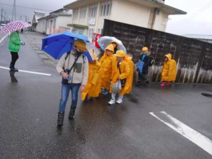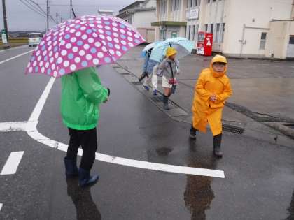 雨が降る中、集団登校に付いてきてくださったり、横断歩道に立ってくださったりして、子供たちを見守ってくださった地域の方々、保護者の皆さん、どうもありがとうございました。