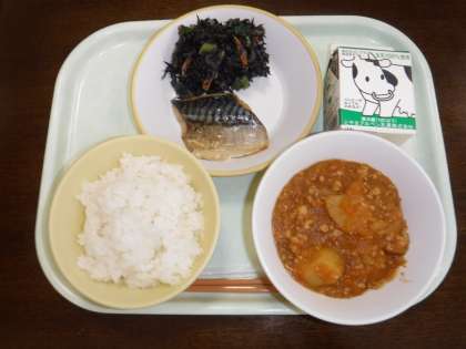 熱々、ほくほくのジャガイモがおいしい季節になりました。今日は、鶏挽肉、ジャガイモ、にんじん、玉ねぎ、インゲンがたっぷり入ったそぼろ煮でした。