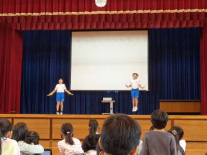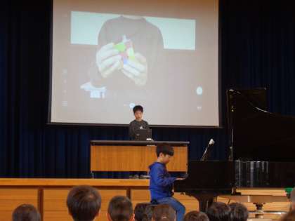 11月16日(木) 4年生 自慢したい会 2 公開日 2023/11/16 更新日 2023/11/16 4年生 感謝の集いのプログラムの中に、自慢したい会2があり、4年生からも2組出場しました。単縄跳びの様々な技、ピアノ演奏&ルービックキューブを披露しました。 たくさんのお客さんの前で発表したことで、更に自分の「好き」な気持ちが強まったようです。