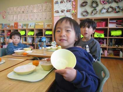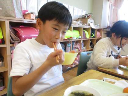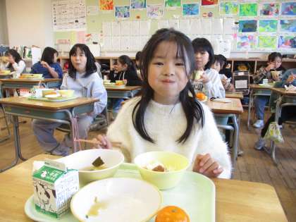 今日の給食では、5年生が大切に育てた老田米が出されました。