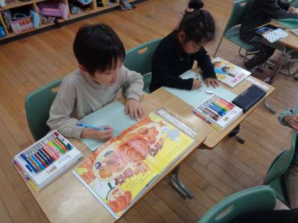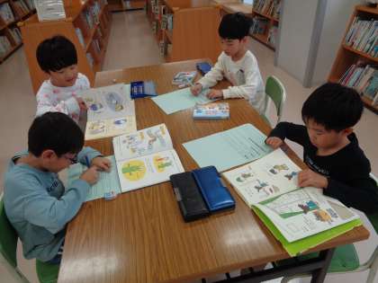 「本をしょうかいしよう」の学習では、本の紹介カードをつくりました。1日1回は、読書の時間を過ごしています。