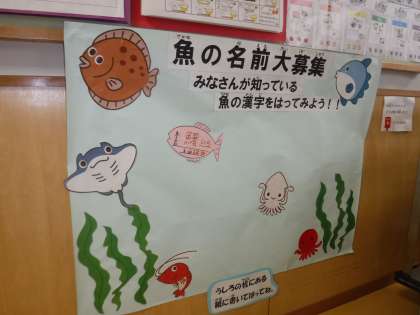 11月29日(水)もりもり委員会発「お魚週間」! 公開日 2023/11/29 更新日 2023/11/29 メール用カテゴリ もりもり委員会が、今、校内に魚の栄養やおいしさを伝え、老田っ子に「お魚を食べよう」と呼びかけています。 校舎のあちこちにお魚クイズが掲示され、子供たちは休み時間にクイズを解いていました。 豊かな海の恵み「お魚」を食べて元気な身体をつくりましょう!
