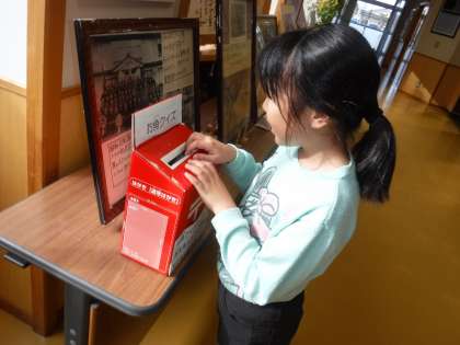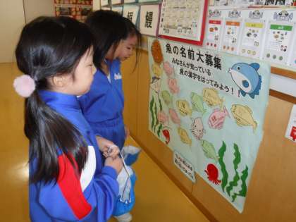 校舎内に魚に関するクイズを掲示したり、魚へんの漢字集めをしたりして、魚に興味関心をもってもらおうと活動しています。