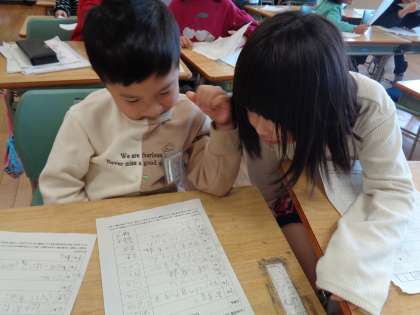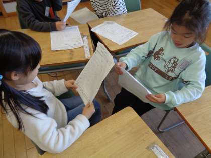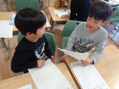 「ありがとうがいっぱい」の学習では、土日に調べてきた、家の仕事をみんなで紹介しました。「お母さんの手伝いをしたい」「皿洗いは、僕にも出来そうだな」と言っていました。
