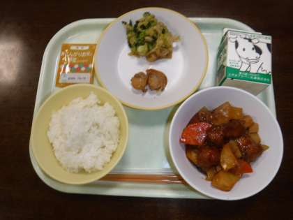 「酢豚」は、下味を付けて米粉をまぶして揚げた豚肉、ジャガイモ、玉ねぎ、にんじん等の野菜に甘酢あんをからめます。酸味と甘味をバランスのよいあんに、食欲がさらに増しました。