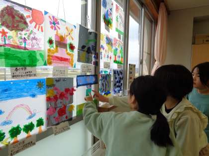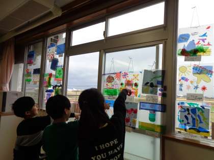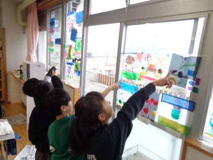 光を通す感じを楽しみ、重なりや組み合わせを工夫してつくっていました。プラスチック段ボールの表だけでなく裏も使って、とてもおもしろい作品がたくさんできました。