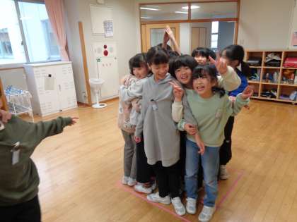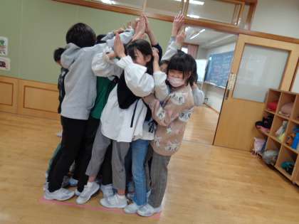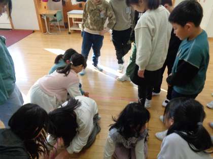 算数科「広さの表し方を考えよう」の学習では、大きな単位として平方メートルを学習しました。実際に1辺が1mの正方形をつくり、みんなで中に入ってみました。
