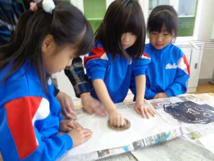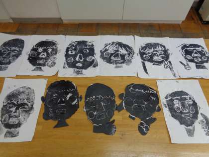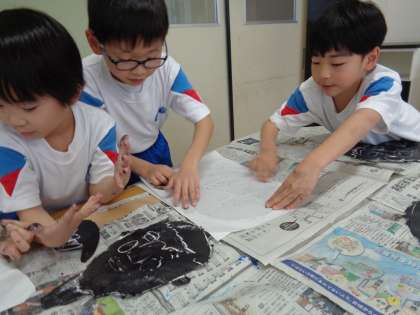 紙版画「はいチーズ!」では、ポーズを決めた自分の顔をよく見ながら作りました。