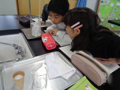 水を冷やしたときの温度の変わり方と水の様子をじっくり観察して調べました。試験管に入れた水が完全に凍ると「お〜」と声が出ている子供たちでした。