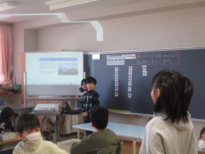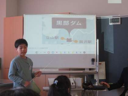 4年生は社会科「富山県の魅力発信!」の学習で調べてきた市町村の魅力をスライドにまとめ、発表しました。写真が映し出されると「わ〜」「きれい」と歓声が上がっていました。初めて知ることもあったようで、「行ってみたい」「見てみたい」と感想を話していました。