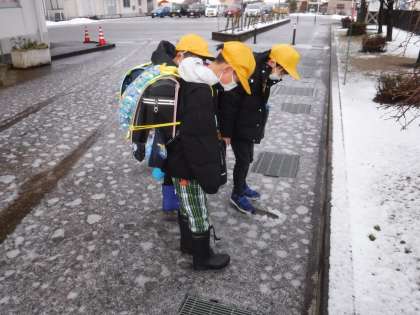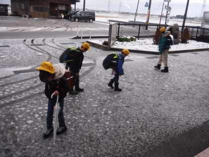 子供たちは、アスファルトにできた模様を不思議そうに見ていました。
