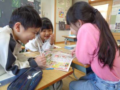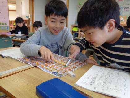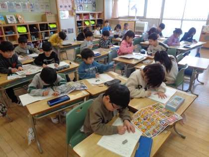 「かたかなのかたち」の学習では、チラシからカタカナの言葉を探しました。形に気を付けてノートに書いていました。