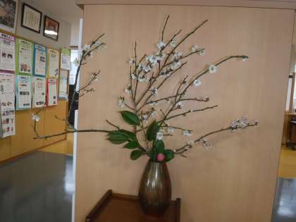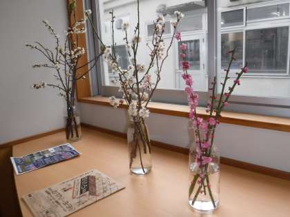 地域の方からお花をいただきました。もうすぐひな祭りだからと桃の花をいただきました。お雛様の隣に飾らせていただきました。
