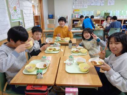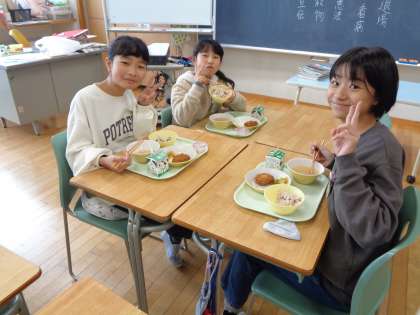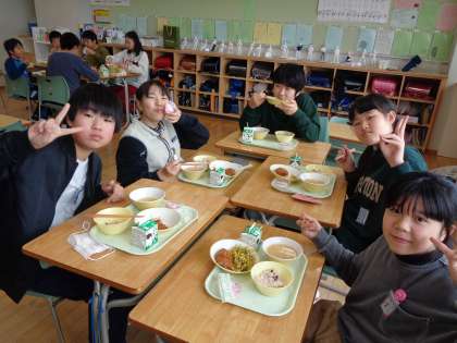 今日の給食はお祝い献立でした。ハート型のにんじんやさくらゼリーから、お祝いの気持ちを感じながら、おいしくいただきました。