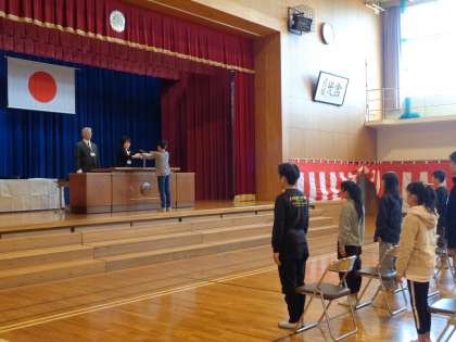 小学校生活最後の修了式を行い、代表が修了証を受け取りました。