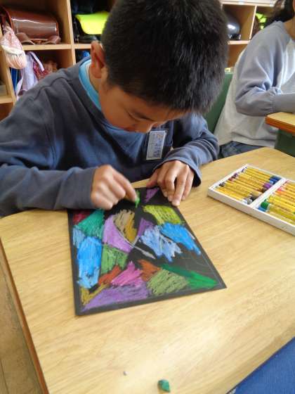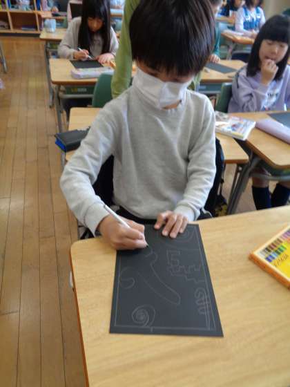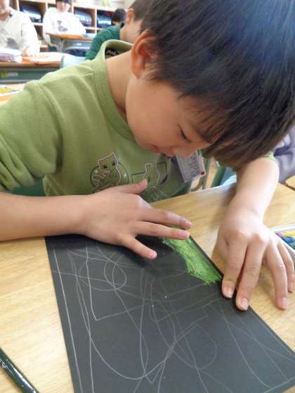 「線と色であそぼう」の学習では、クレヨンを使って、混色したり指で伸ばしたりする等、表し方を工夫していました。