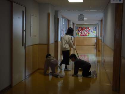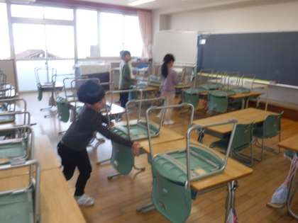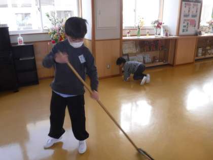 今日の朝の活動は、清掃です。昨年度のたてわり班のメンバー(2〜6年生)で、協力して掃除をしていました。1年生は、教室で雑巾の使い方等の勉強をしていました。