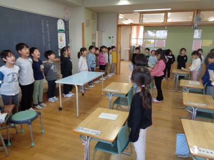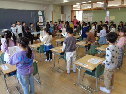 4月11日 1年生 校歌の練習 公開日 2024/04/11 更新日 2024/04/11 1年生 今日は、2年生が1年生に校歌を教えてくれました。2年生がプレゼントしてくれたメッセージ入りの歌詞カードを見ながら、これからも練習をがんばります。