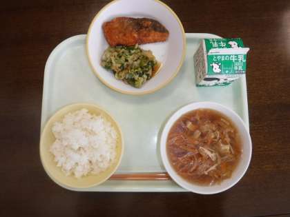 今日の給食の献立は、ごはん、牛乳、魚の竜田揚げ、おひたし、沢煮椀でした。