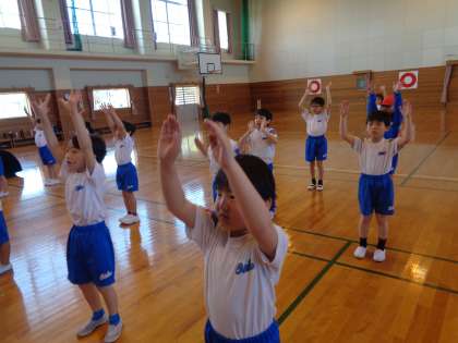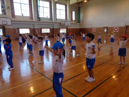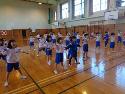 体育の授業で「遺伝子ダンス」の練習をしました。動画を見ながら元気いっぱいに体を動かしていました。