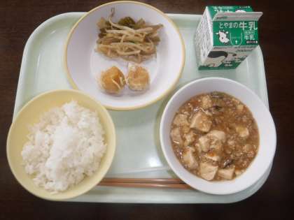今日の給食の献立は、ごはん、牛乳、にんじんシューマイ、茎わかめのチョナムル、マーボー豆腐でした。