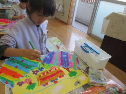 図画工作科「ふしぎなたまご〜カラフルたまごから生まれたよ〜」では、オリジナルたまごから様々なものや世界が生まれました。どの子供も楽しそうに色を着けていました。