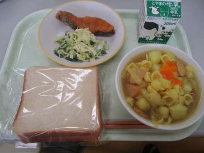 4月17日(水)今日の給食 公開日 2024/04/17 更新日 2024/04/17 本日の給食 今日の給食の献立は、食パン、牛乳、カレースープ、揚げ魚のレモン味、そえ野菜でした。カレースープはスパイスを感じつつもまろやかで、おいしくいただきました。