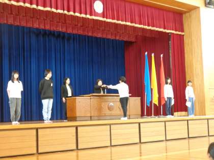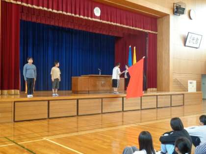 校長先生から委員長には任命証が、団長には団旗が渡されました。