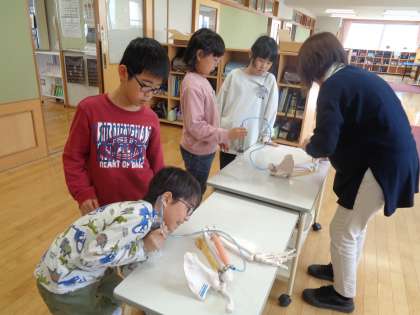 実際に自分の体を動かしたあと、模型を使って、骨や筋肉はどのような動きをしているのか確認しました。