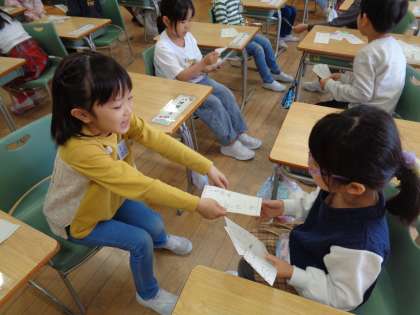 1年生は、国語科で「どうぞよろしく」の学習をしました。心を込めて作った名刺をうれしそうに交換していました。