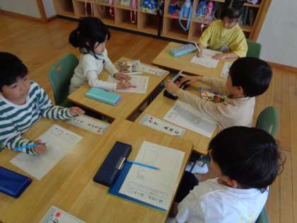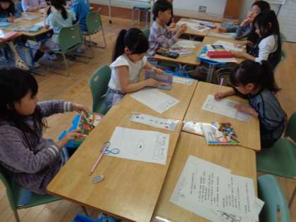 探検で発見したことをカードに絵で表しました。給食室の大きなお鍋や職員室の電話など、さまざまな発見があったようです。