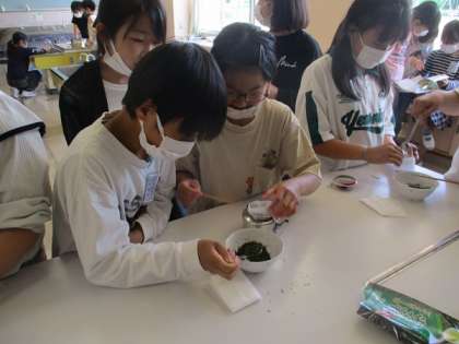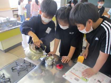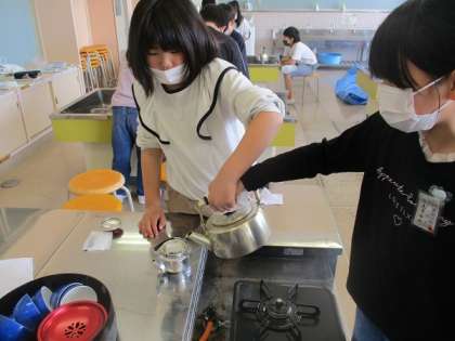 今日は初めての調理実習があり、みんなでお茶を煎れました。しっかり準備をして、上手にコンロを使っていました
