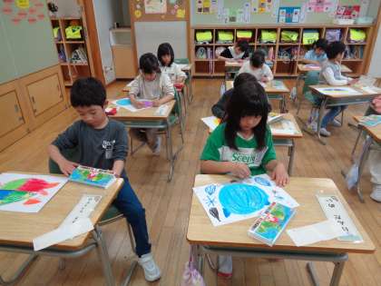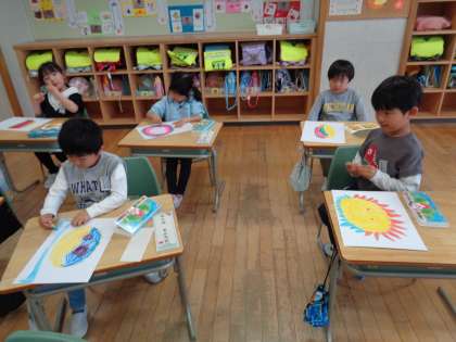5月1日(水)1年生 図工 公開日 2024/05/02 更新日 2024/05/02 1年生 クレヨンを使っておひさまの絵を描きました。にこにこ笑顔のおひさま、元気いっぱいのおひさま、さわやかな色使いのおひさまなど、かわいい作品に仕上がりました。