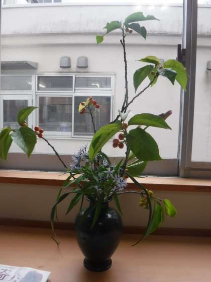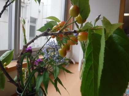 地域の方が、お花を持ってきてくださいました。実の付いた桜の枝もあります。ツヤツヤのきれいなサクランボが、たくさん実っていました。