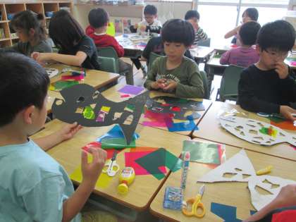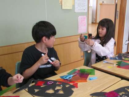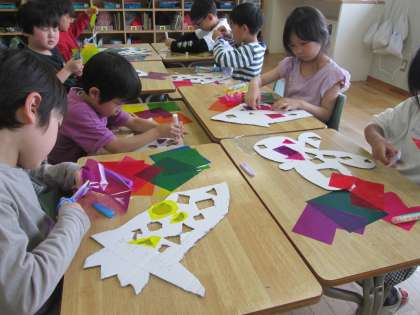 色の重なりを工夫しながら、セロハンを貼ってすてきな作品になってきました。
