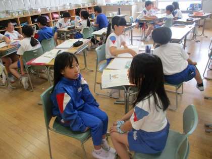 今日は理科の学習で「発芽に必要な条件」を調べるための実験セットを作りました。また、国語科では「きいて きいて きいてみよう」の学習に入り、今日はインタビューの練習を近くの人としました。