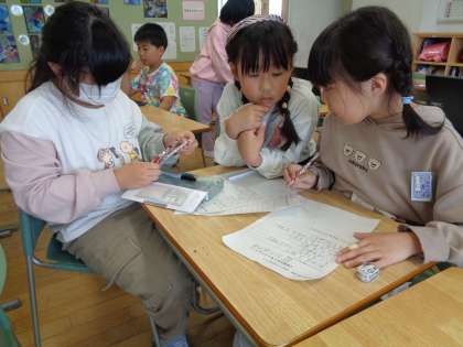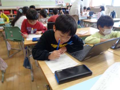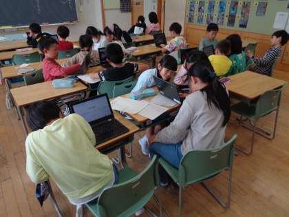 「老田のすてきを広めよう」の学習では、梨について調べています。知りたいこと、不思議なことがたくさんあるようで、明日は果樹園へ行って調べてきます。