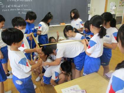 5月8日(水)5年生 体積の学習 公開日 2024/05/08 更新日 2024/05/08 5年生 今日は算数で1立方メートルを学習しました。実際に中に入ってみると9人の子供が入り、みんな歓声を上げていました。また、プールはそれがいくつ入るのかも考え、量の多さに驚いていました。
