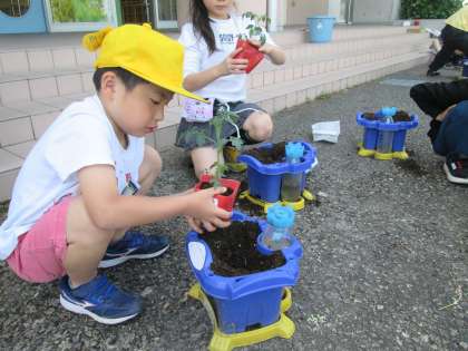土を軟らかくし、優しくポットから取り出して「大きくなあれ」「おいしくなあれ」と言いながら植えました。