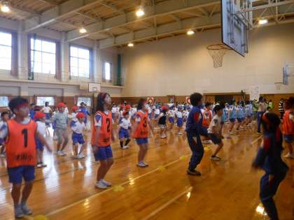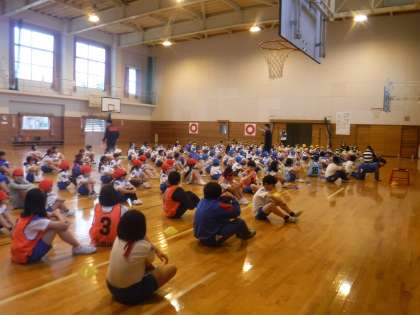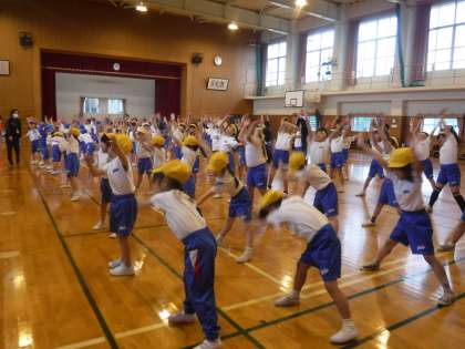 運動会の全体練習を行いました。整列の仕方を確認したり、ラジオ体操の練習をしたりしました。後半は色団ごとに応援練習をしました。