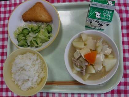 今日の給食の献立は、ごはん、牛乳、はんぺんフライ、きざみ和え、豚汁 でした。