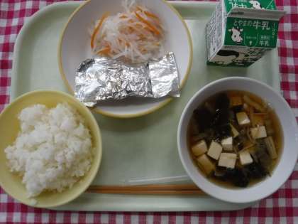 5月14日(火)今日の給食 公開日 2024/05/14 更新日 2024/05/14 本日の給食 今日の給食の献立は、ごはん、牛乳、さばの銀紙焼き、なます、すまし汁 でした。なますは、優しい酸味で子供にも食べやすい味付けでした。
